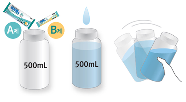 1 A제(1포)와 B제(1포)를 500ml 통에 넣은 후, 찬물 500ml를 표시선까지 채운 다음 뚜껑을 닫고 완전히 녹을 때까지 흔들어 줍니다.