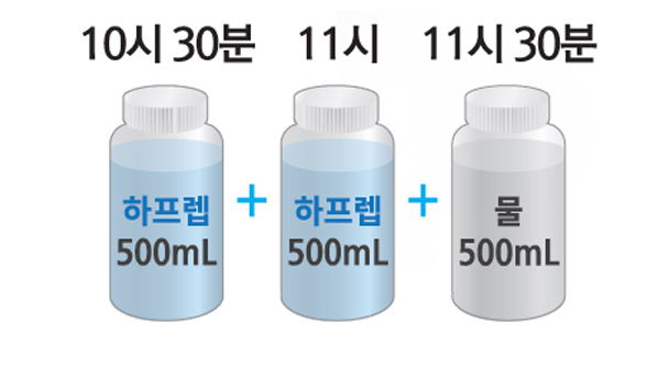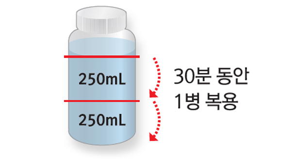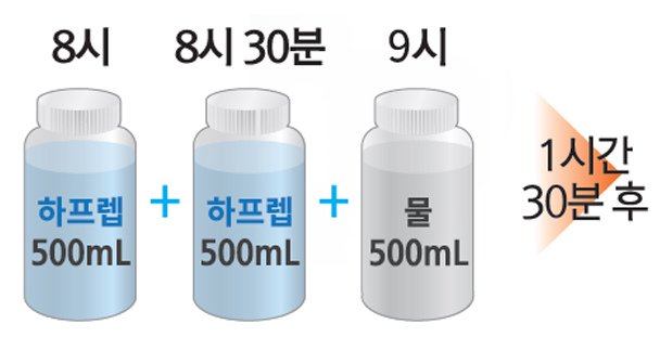 2 1의 과정에서 조제한 하프렙액 500mL를 30분 안에 15분 간격으로 두번에 나누어 모두 복용합니다.