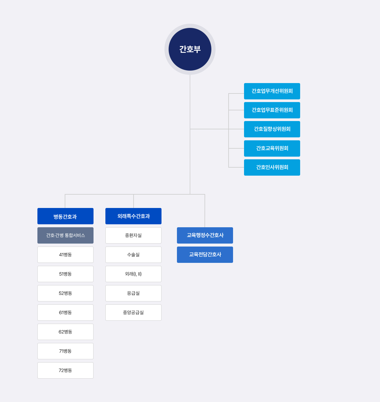 간호부 페이스북 X 네이버밴드 sns 공유 리스트 닫기 간호부장 인사말 미션과 비전 조직도 연혁 간호부 교육 간호부 소식 관련사이트 간호부 간호업무개선위원회 간호업무표준위원회 간호질향상위원회 간호교육위원회 간호인사위원회 병동간호과 간호·간병 통합서비스 41병동 51병동 52병동 61병동 62병동 71병동 72병동 외래특수간호과 중환자실 수술실 외래(I, II) 응급실 중앙공급실 교육행정수간호사 교육전담간호사